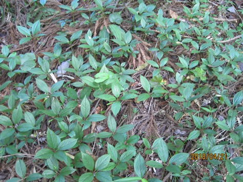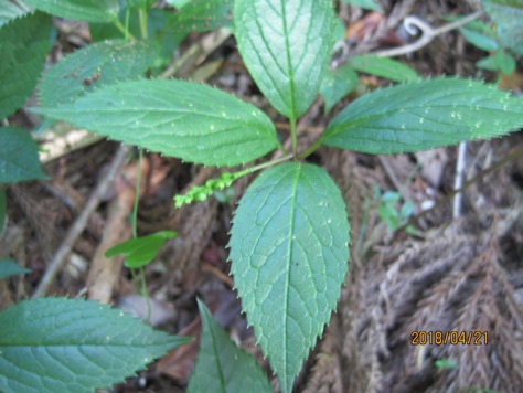 葉は4枚が輪生状に付き光沢があり、縁には鋸歯がある。